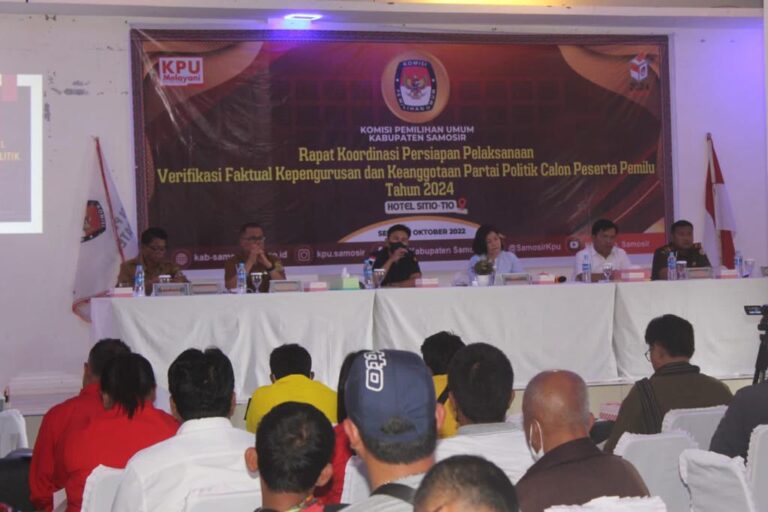 SAMOSIR, DELITIMES.ID – Komisi Pemilihan Umum (KPU) Kabupaten Samosir menggelar rapat koordinasi persiapan pelaksanaan verifikasi faktual (Verfak) kepengurusan dan keanggotaan partai politik calon peserta Pemilu