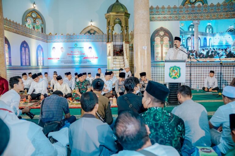 MEDAN, DELITIMES ID – Ribuan umat Muslim menghadiri peringatan Maulid Nabi Besar Muhammad SAW 1444 H yang diselenggarakan Pemko Medan di Masjid Raya Al Mashun,